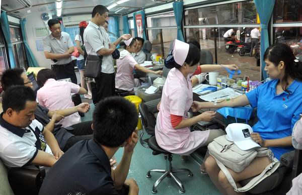 在献血车上,党员成为献血队伍的“主力军”。省社科院马克思研究所的贾绍俊早早就站在献血的队伍中,经过40多分钟的排队、填表、测血压,最终献出了400毫升的血液。“我用献血的方式来纪念党的生日,我觉得很有意义。献血既是每个公民的义务,更是党员发挥先锋模范作用的体现。”来自不同战线的党员从“80后”到“50后”,他们紧握拳头,沉稳而庄重,仿佛在党旗前宣誓一样,用同样的姿势来践行当初的诺言。从早上8点30分,献血车迎来第一个党员开始,在不到一个小时内,已经有20位党员带头义务献血。