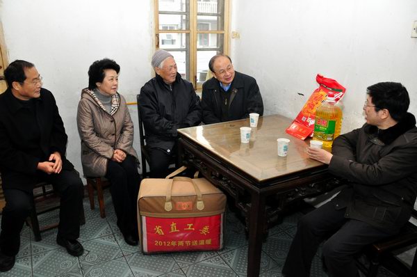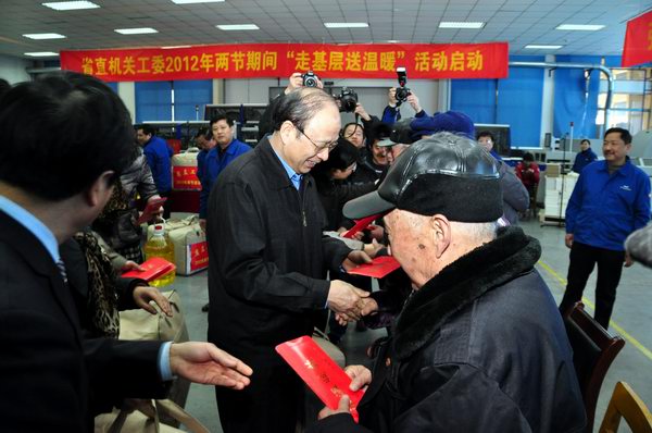2012年1月6日上午,省直机关工委2012年两节期间“走基层送温暖”活动启动仪式在安徽新华印刷有限公司举行。省直工委书记张国富,省直工委委员、巡视员王志军出席仪式并向每位困难劳模赠送了一床棉被、一袋大米、一桶食用油和3000元慰问金,向每位困难职工赠送一床棉被、一袋大米、一桶食用油和500元慰问金。启动仪式后,张国富、王志军来到困难劳模刘福荣家中,将棉被、大米、食用油和3000元慰问金送到刘福荣手中。