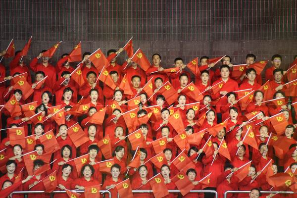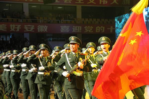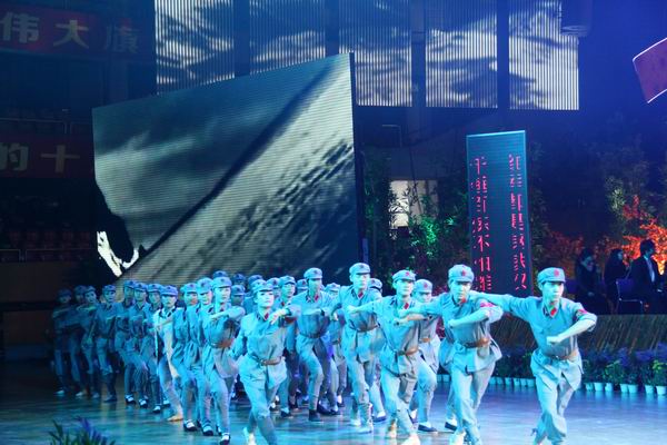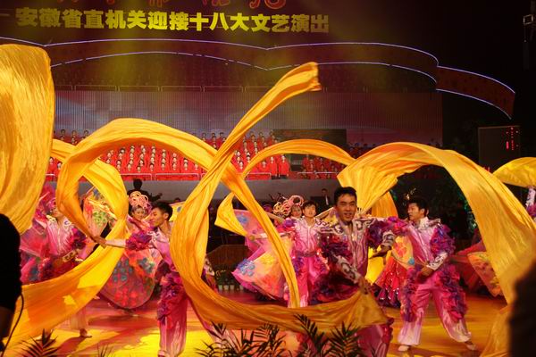 伴随着恢宏的交响乐《红旗颂》奏响,文艺演出拉开了帷幕。文艺演出共分“党旗高扬”、“江淮礼赞”、“先锋颂歌”、“奔向明天”四个篇章。《南湖的船党的摇篮》、《过雪山草地》、《我要去延安》等革命歌曲,唱响共产党不畏艰难险阻,经过90多年的拼搏探索,创造前所未有的辉煌;配乐诗朗诵《党心民心心连心》和歌曲《江山》,声情并茂地述说我省紧紧抓住机遇,坚持科学发展,跻身全国快速发展前列的历程;歌曲《做人》、话剧《生命之路》和《无悔的追求》,再现沈浩、陈巍、周全报、李传扬等先锋模范的感人事迹,引起全场观众共鸣,掌声经久不息;《永远跟党走》、《走向复兴》等大合唱,表达机关干部职工永远跟党走的坚定决心,对实现中华民族伟大复兴的坚定信心。整台文艺演出集音、舞、诗、画、剧于一体,主题鲜明,气势磅礴,清新优雅,高潮迭起。省直机关广大干部职工满怀喜悦,载歌载舞,尽情抒发爱党爱国爱民、献身中国特色社会主义伟大事业的炽热情怀。文艺演出在全场合唱《没有中国共产党就没有新中国》的嘹亮歌声中落下帷幕。