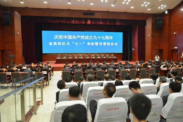 6月29日下午,省高院机关召开“七一”表彰暨党课报告会,热烈庆祝中国共产党成立九十七周年。会上,省高院党组书记、院长董开军作了题为“强化新担当、展现新作为、奋力谱写新时代安徽法院工作的新篇章”的党课辅导报告。党组成员、院领导、其他厅级领导同志和党员干警300余人参加了党课报告会。会议由省高院党组成员、副院长、机关党委书记徐致平主持。