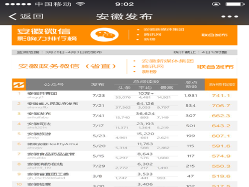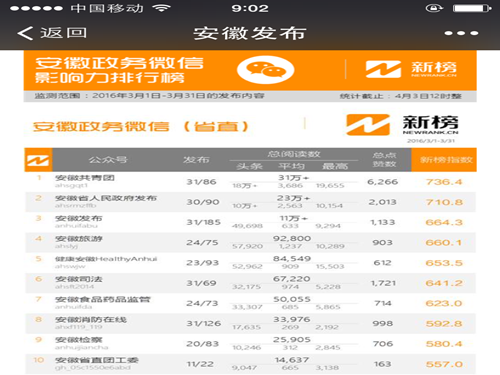 安徽微信影响力排行榜政务类周榜(2016年3月28日—4月3日),排名第九