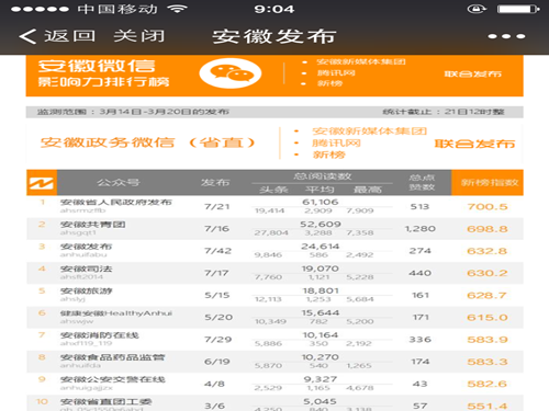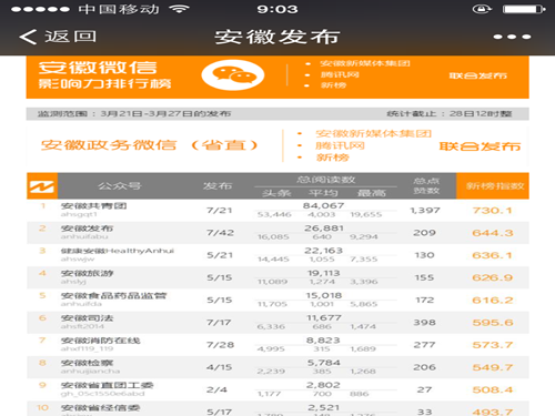 安徽微信影响力排行榜政务类周榜(2016年3月21日—3月27日),排名第九