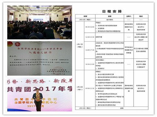 本次学术年会秉持“以文赴会”原则,围绕新形势下学校共青团思想引领、素质拓展、权益服务、组织提升、改革创新等专题,面向全国征集学术论文。通过初评、终评、公示等环节,共评选出学术年会入选论文115篇。安徽行政学院团委书记郝永华副教授撰写的《经验学习圈视域下的高校共青团“四进四信”活动现状分析及优化路径》入选为年会论文,前往北京参加学术年会并应邀在专题研讨和冷餐交流会上作主题发言。