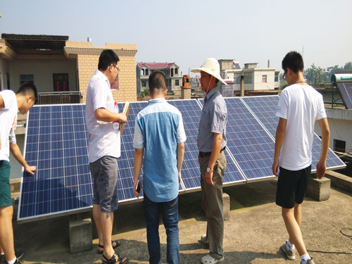 7月26、27日,实践队员到达郜台乡一贫困村——安台村,调研该村光伏精准扶贫工程的建设情况和贫困户增收情况。实践队员实地考察光伏电站规模、光伏设备安装、并网发电等情况,在安台村村委会工作人员的带领下,实践队员走访该村贫困户,了解光伏发电扶贫对贫苦户家庭增收的影响。当说起一年光伏发电并网可收入约3300元时,贫苦户由衷地感谢党和政府扶贫政策好。此项收入虽不算多,但对贫苦户来说犹如雪中送炭。