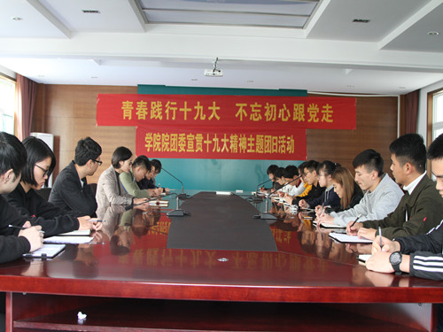 主题团日活动在团委书记上团课中开始。团委宋书记以《新时代、新青年、新要求、新行动》为题,号召广大团员青年认真学习十九大会议精神,深刻领会精神内涵,结合自身学习工作实践,制定新目标,落实新要求,开创我校共青团工作新局面。