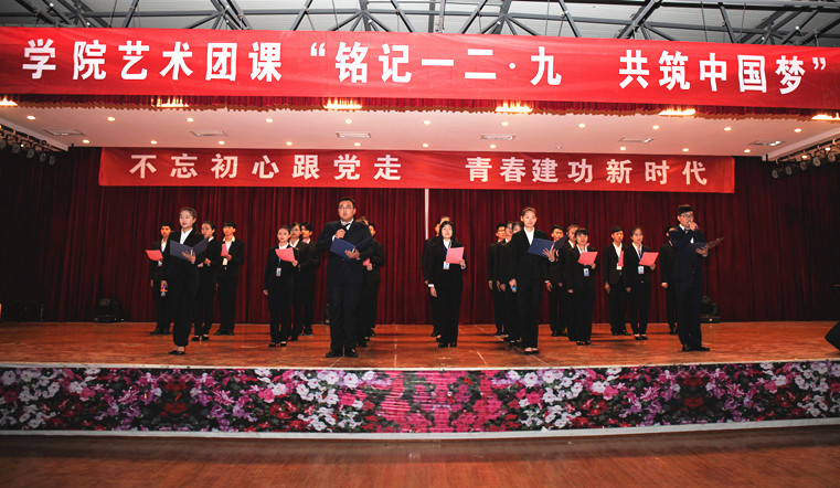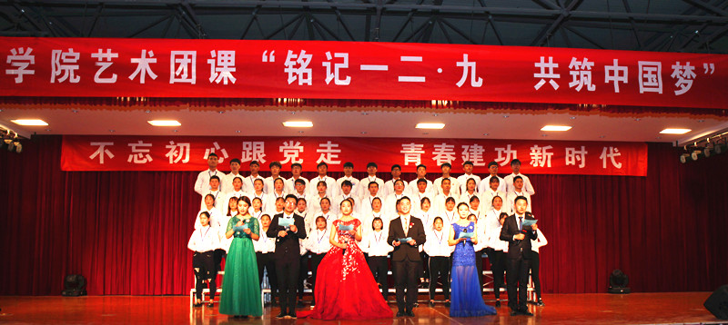 “不忘初心跟党走,青春建功新时代”主题艺术团课暨“铭记一二·九 共筑中国梦”文艺汇演由院团委、各系团总支主办,全院学生社团和学生会协办。全院学生社团在挂靠部门和院系两级团组织的指导下,以纪念“一二·九”爱国运动为核心,围绕主题“不忘初心跟党走,青春建功新时代”,精心选材,加强协作,认真排演。演出节目形式多样,主题突出,感染力强,受到师生点赞。