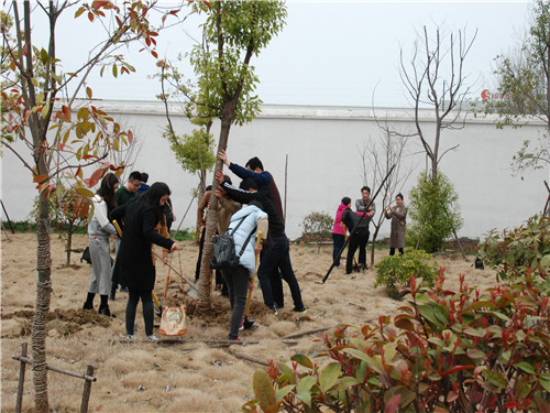 植树现场,大家有分工、有合作,配合有序,有的挥锹铲土、有的扶树填土、有的培土浇水,忙的不亦乐乎。桃树、梨树、杏树一棵棵的拔地而起,半天功夫,一小片民政青年果树林俨然呈现。