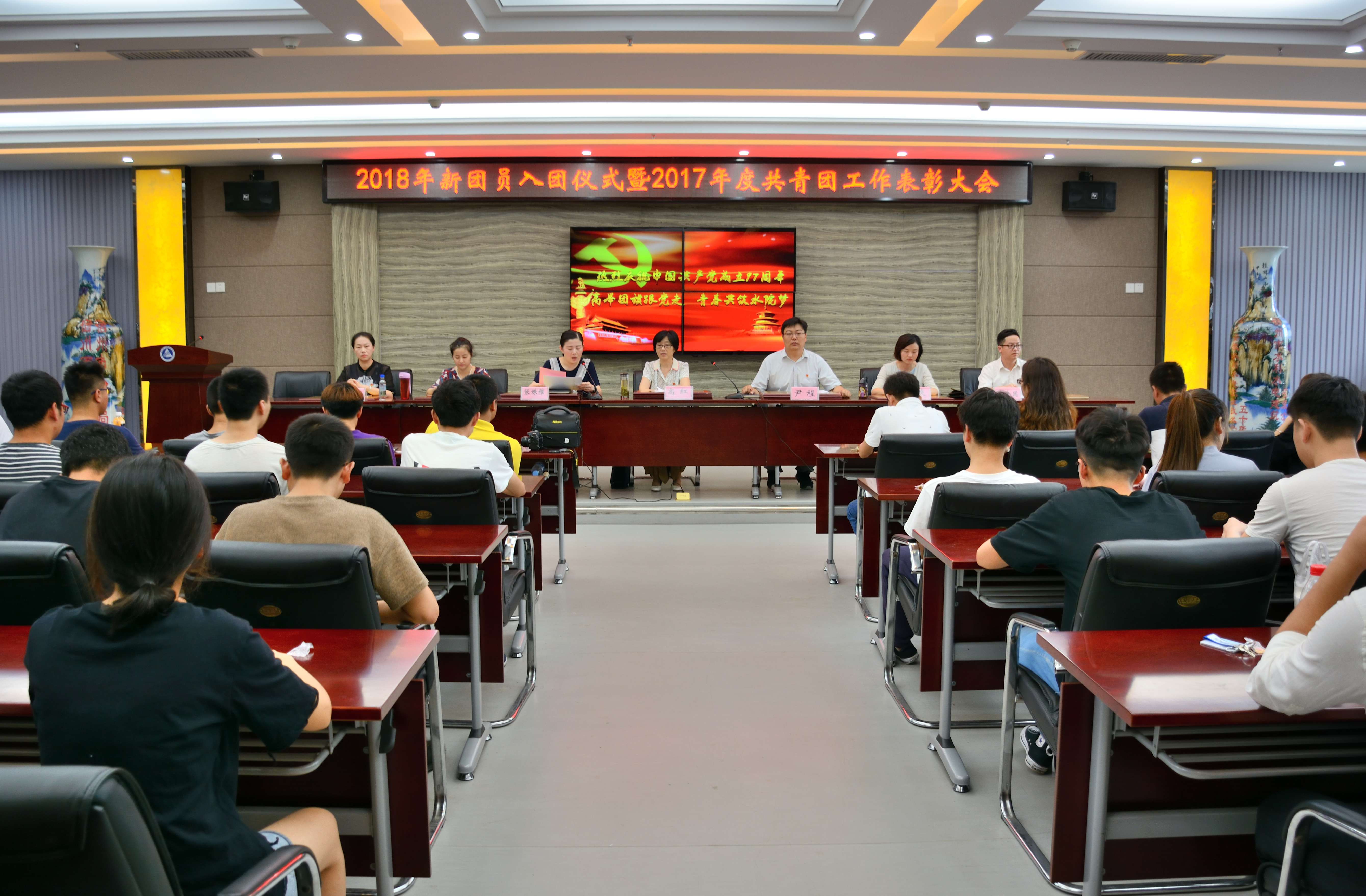 6月27日上午,在全国上下喜迎中国共产党建党97周年,全团热烈庆祝中国共产主义青年团第十八次全国代表大会胜利召开之际,安徽水利水电职业技术学院团委在图书馆三楼会议室隆重举行2018年新团员入团仪式暨2017年度共青团工作表彰大会。党委委员、建筑工程学院党总支书记高红出席了本次活动,各院(部)团总支书记及学校33名新团员和部分老团员代表出席仪式。