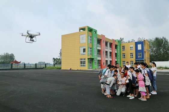 孩子们兴致勃勃地观看无人机飞行