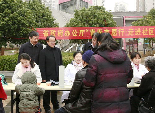 根据省直团工委《关于开展2019年“青春志愿行”主题志愿服务活动的通知》,按照《省政府办公厅2019年党建活动方案》安排,3月3日,厅团委、文明办组织青年深入社区开展“青春志愿行”志愿服务活动。省政府副秘书长、办公厅机关党委书记汪春明,省政府副秘书长郑训练专程赶到活动现场看望慰问青年志愿者。来自省政府网站、机关服务中心、机关幼儿园、机关医院和省政府政研室的十余名青年志愿者参加了活动。