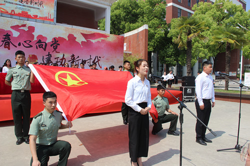 伴随着雄壮嘹亮的国歌,思政课教师亢敏上了一堂“与时代共进,纪念五四运动100周年”微团课;团旗下,青年团员接过理想火炬,表达了坚定不移听党话、跟党走的坚定决心;入团仪式上,老团员为新团员佩戴团徽,带领新团员郑重宣誓。
