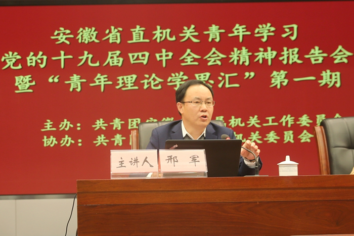 全省“举旗帜 送理论”党的十九届四中全会精神省级宣讲团成员、省社会科学院当代安徽研究所所长、研究员邢军从坚持和完善中国特色社会主义制度、推进国家治理体系和治理能力现代化的重大意义,深刻领会中国特色社会主义制度和国家治理体系的显著优势、坚定中国特色社会主义制度自信,坚持和完善中国特色社会主义制度、推进国家治理体系和治理能力现代化的总体要求、总体目标和重点任务,加强党的领导、确保全会确定的各项目标任务全面落实到位等四个方面,阐明了党的十九届四中全会召开的重大意义,阐释了中国特色社会主义制度和国家治理体系的显著优势,并就全会《决定》提出的总体要求、总体目标和重点任务进行了系统解读。邢军还和广大团员青年进行了互动交流,解答了大家关心的诸如“怎样理解党的领导是推进国家治理体系和治理能力现代化的关键所在、强化制度意识重要性”等热点焦点问题。