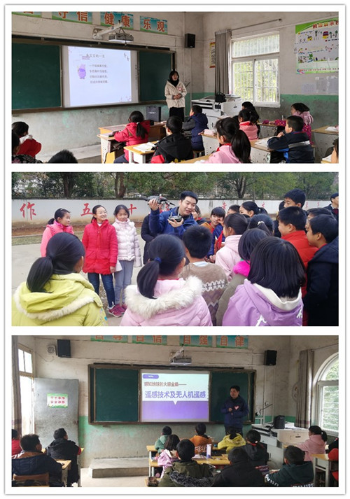 看!无人机正在天上飞呢。省地矿局的青年志愿者将六年级的课堂后半程设在了学校操场上,现场演示了无人机操作、飞行、起降,让全校同学一饱无人机眼福,并现场讲解了无人机的各个组成部件及无人机在电力巡线、农业植保、消防救援、快递物流、军事侦查等领域的应用。课程前半段,志愿者在教室通过PPT为同学们上了遥感技术及无人机遥感科普课,向同学们讲解了遥感是什么,卫星遥感和无人机遥感技术的发展应用等知识,使同学们对感知地球的火眼金睛——遥感技术有了初步认识。