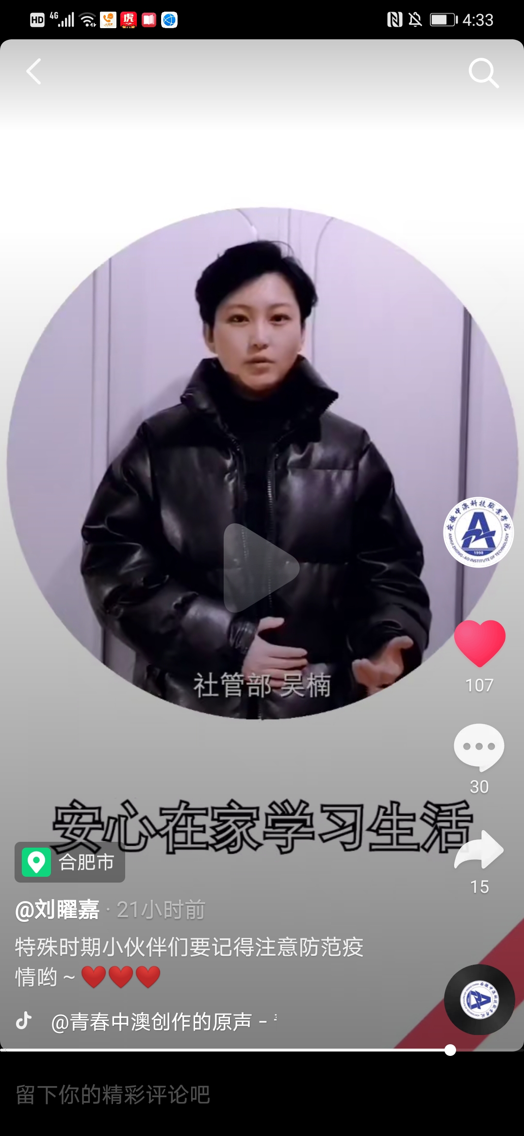连日来,安徽中澳科技职业学院团委认真贯彻上级团组织和学院疫情防控工作领导小组精神,坚决落实团省委、省直团工委以及学院要求,积极开展新型冠状病毒感染的肺炎疫情防控线上宣传工作。