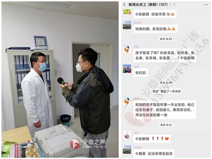 鼠年正月初一,儿子呱呱落地。闻知新型肺炎疫情严峻,张鹏钢随即吻别妻儿,离开医院,奔赴基层一线采访。1月26日即采写了《宣城市宣州区对酒店、宾馆、商场等公共场合全面加强疫情防控》《宣城市新增新型冠状病毒感染的肺炎疑似病例2例》《黄山市所有A级以上景区全部暂停对外开放》《黄山市屯溪区多举措积极做好新型冠状病毒感染的肺炎疫情防控》等4篇报道,此后每天发表不少于3条录音、连线或新媒体报道。妻儿尚未出院,他请来母亲和岳母一起照顾,每天采访结束后,自己趴在医院床头翻录音、写稿子,连续几天难以合眼休息,连给孩子取名字都无暇顾及。