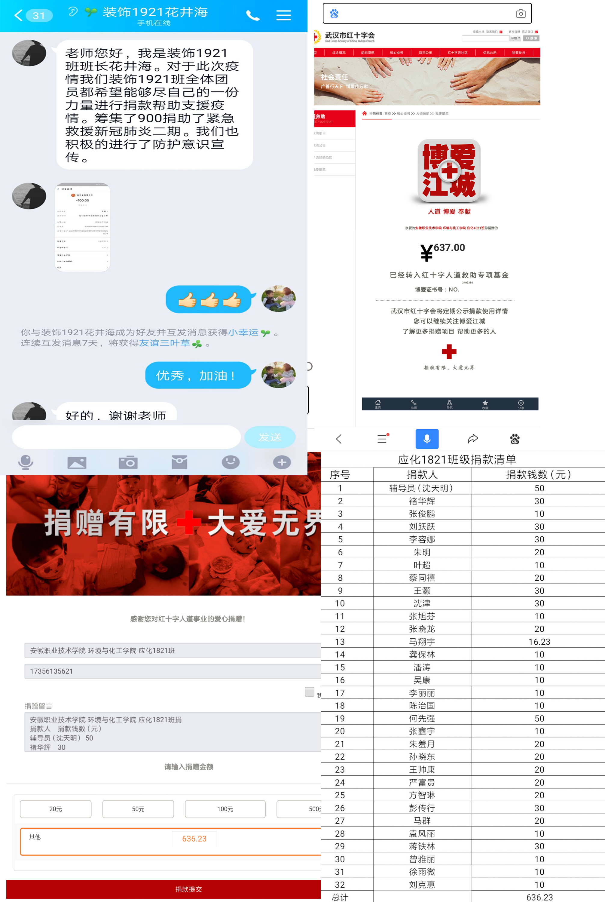 一方有难,八方支援。我校应化1821班、装饰1921班等班级团支部在疫情发生的第一时间,对班级同学发出捐款倡议,对武汉进行支援。学校的老师、同学们纷纷积极响应、分别以个人捐献、集体捐献等方式为助力一线疫情防控先出自己的爱心。