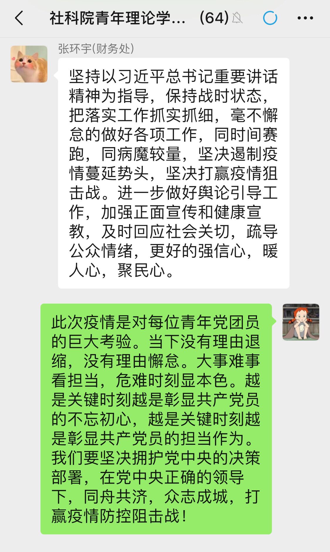 收到省直机关工委的学习通知后,我们第一时间编写了学习材料,并借助“青年理论学习e家”微信群将学习材料发送给全院63名青年党团员,督促每一位青年及时做好个人自学,并组织开展线上研讨。通过学习,大家一致认为习近平总书记的重要讲话和一系列重要指示深刻阐述了疫情防控的重大意义、基本策略和重点举措,作为青年的我们要肩负起职责,带头坚决贯彻指示精神,从自身做起,以实际行动践行听党话、跟党走的初心使命。